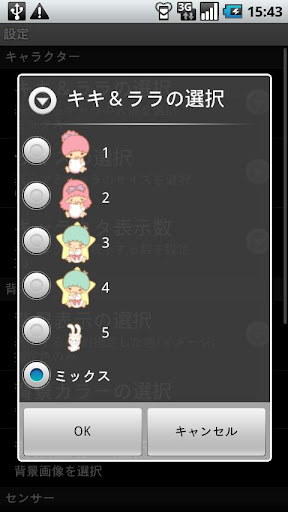 画面をキキ&ララでいっぱいにして楽しもう!携帯を振ったり、傾けたりするとキキ&ララが反応!さらに画面をタッチするとキキ&ララの表情も変わる♪マスコットのサイズは5段階に調節可能!画面に表示する数も好みに合わせて変えられるよ♪
