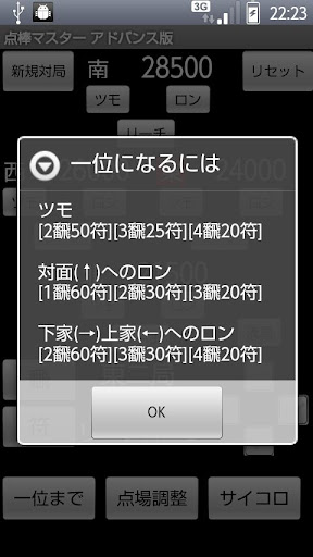 役数と符数を入力するだけの簡単操作!麻雀における点棒の動きをすべて追えるアプリです。点棒が無い時、カード麻雀の小さい点棒を使いたくない時はもちろん、これを使えば相手の点棒をすべて把握することで通常の麻雀を有利に運ぶことができます。麻雀によくある「今何点?」も無くなります。アドバンス版ではさらに一位になるためのアガリを表示する機能の他、あらゆるルールにも対応可能な仕様となっています。(アドバンス版が重いと思う人は通常版をご利用下さい)