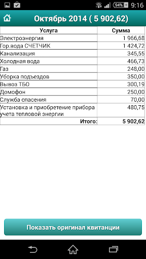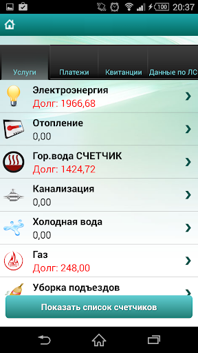 Просматривать информацию о приборах учета, показаниях, тарифах и поставщиках по каждой услуге;