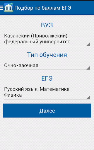 Приложение для абитуриентов Казанского федерального университета (КФУ): подбор специальностей для подачи заявления в соответствии с выбранными предметами ЕГЭ. Оценка шансов поступления на выбранную специальность. Просмотр поданных в КФУ заявлений: состояние заявления, позиция в общем рейтинге, позиция в рейтинге по оригиналам.
