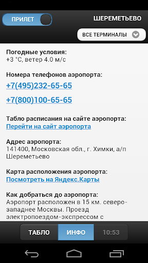 Информация в приложении носит справочный характер и мы рекомендуем уточнять ее на сайте аэропорта и по телефону справочных служб, что удобно реализовано в приложении.