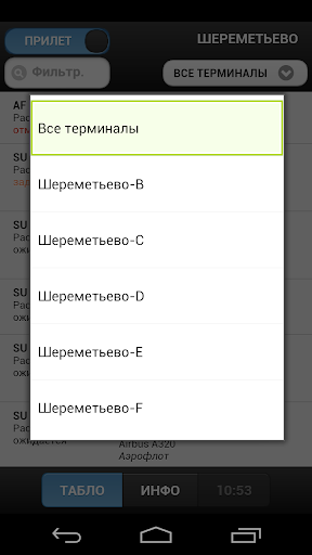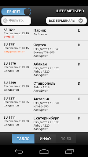 Приложения для просмотра информации о состоянии и расписании авиарейсов крупнейших аэропортов СНГ и Зарубежья онлайн. Показывает задержки и переносы.