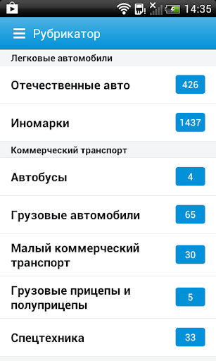 - предложения о продаже по рубрикам: отечественные авто и иномарки, коммерческий грузовой транспорт, автобусы, спецтехника, прицепы, мотоциклы, скутеры, гидроциклы, лодки, автозапчасти, шины и диски;