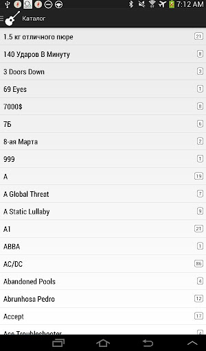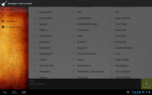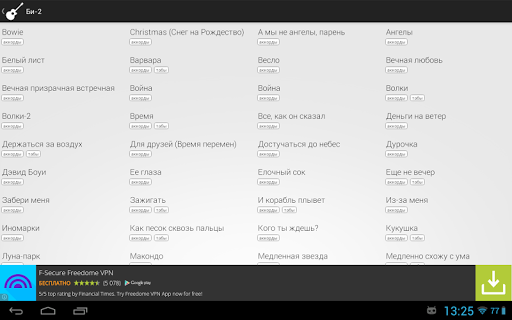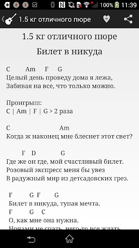 Огромный сборник аккордов и текстов песен российских и иностранных исполнителей. Для работы приложения не нужно подключение к интернету, тексты песен уже загружены, достаточно просто запустить приложение и они сами установятся.