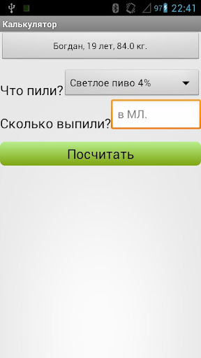 Данная программа предназначена для оценки Вашего состояния и для того, что бы вы могли хотя бы приблизительно представить себе время следующей поездки на машине в качестве водителя. Данная программа не является доказательством для сотрудников ГИБДД так же как и не является доказательством в суде. Есть еще много много факторов которые влияют на скорость опьянения и на скорость вывода алкоголя из организма, такие как: вес, возраст, пол, время суток(!), пустой/полный желудок, а так же состояние здоровья, например язвенникам вообще противопоказано принимать алкоголь, но в то же время алкотестер покажет что у них 3 промилле. Все относительно. В следующих версиях программы я добавлю больше данных для ввода для более точных вычислений.