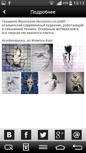 Устанавливайте приложение “Альбом современного искусства”. Делитесь с друзьями в социальных сетях: Вконтакте, Facebook, Twitter или e-mail. Сохраняйте самые интересные работы в Избранном!