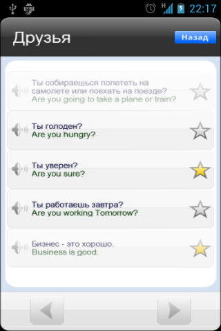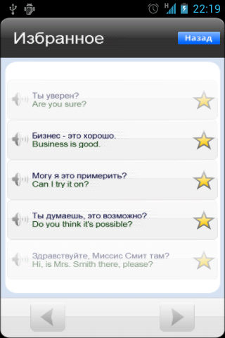 Представьте, что вы поехали в путешествие, или в отпуск в другую страну. Вы попадете в различные ситуации с жителями другой страны, вы будете общаться на улице, в магазине, по телефону и может быть еще где-нибудь. Вам придется носить с собой словарик, что бы общаться на мало знакомом вам языке. Это приложение позволит вам обойтись без словаря, т.к. в нем отобраны наиболее популярные фразы, которые вам предстоит сказать или услышать. Более того, в приложении вы можете прослушать фразу, добавить в избранное, что бы не пришлось потом долго искать. Вы можете проверить свои знания на тестировании.