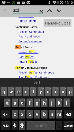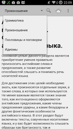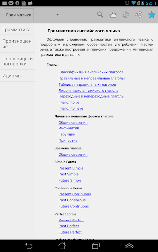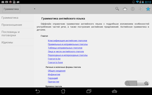 В программе собраны справочные материалы по грамматике английского языка, произношению, а также пословицы и поговорки. Понятное и подробное описание всех частей речи и времен английского глагола поможет всем изучающим английский язык правильно строить предложения и не совершать ошибок в речи и письме. Отдельно рассматриваются особенности фонетики произношения английского языка, включая особенности американского произношения, наиболее характерные особенности произношения снабжены звуковым примером произношения. Справочник не зависит от наличия Интернет соединения и может быть использован всюду, в метро, на занятиях и даже в ночном клубе, если будет такое желание.