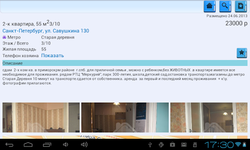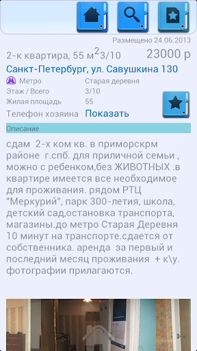 Все объекты рынка аренды прямо в Вашем телефоне/планшете где бы Вы ни находились! Вам нужно лишь иметь активный доступ (полный доступ платный) и устройство под рукой. Добавляйте полюбившуюся квартиру в избранное, звоните собственнику из приложения, делитесь объектами в социальных сетях и получайте моментальные уведомления о новых объектах с сайта... А самое главное - имейте доступ к самой полной информации только от собственников всегда и везде!
