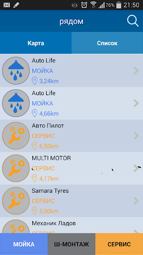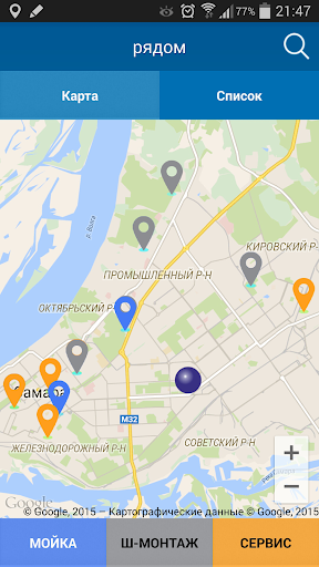 - Поиск ближайших автомоек, шиномонтажных мастерских, автосервисов.