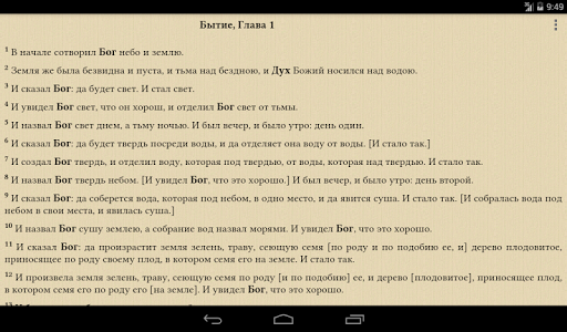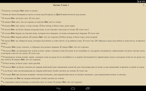Библия Синодальный Перевод - это электронная реализация этой превосходной книги. Теперь вы можете читать Библию прямо с вашего телефона или планшета. Библия полностью устанавливается на устройство и не требует постоянного Интернет соединения. Удобный интерфейс приложения и скорость его работы сделает чтение Библии максимально приятным.