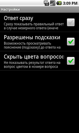 - Режим экзамена (несколько случайных вопросов из всех тем)