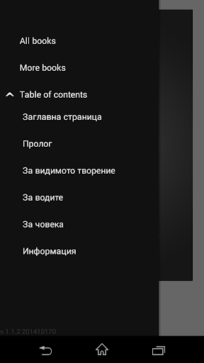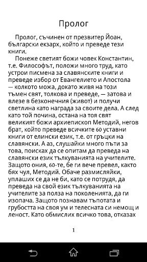 Books Forge запаметява до коя страница сте стигнали, можете да споделите любим цитат, има възможност за избор между дневен и нощен режим и сила на подцветката, шрифт и големина и можете да преминавате от една глава в друга по избор от съдържанието.