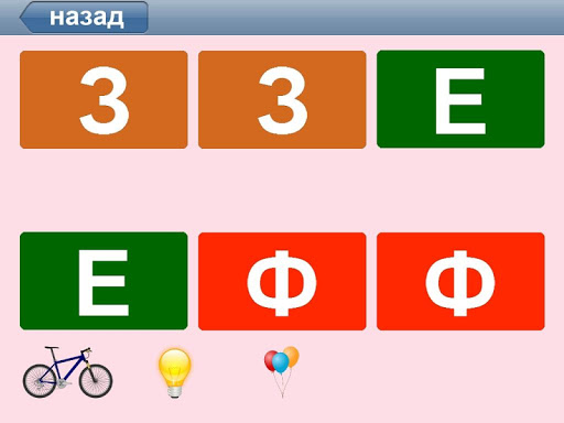 * Поиск пары по цвету – ребёнок находит карточки с одинаковым цветом и символом. Разные цвета карточек помогают найти правильный ответ.