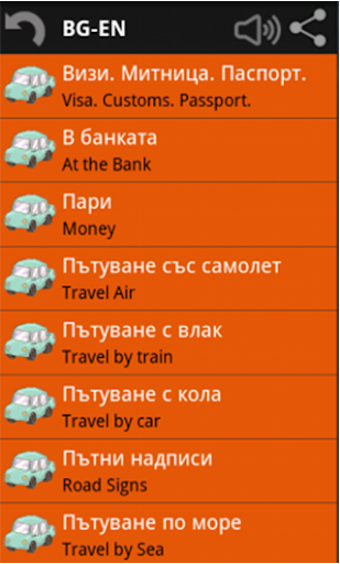 Можете да чуете всеки английски израз, чрез използване на стандартния TTS (ако е инсталиран) на вашия телефон. Научете основни фрази на английски, необходими за пътуването. С този разговорник ще бъдете уверени във всяка ситуация.