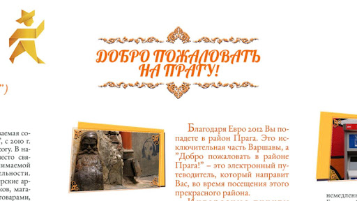 Благодаря Евро 2012 Вы попадете в район Прага. Это исключительная часть Варшавы, а ”Добро пожаловать в районе Прага!” – это электронный путеводитель, который направит Вас, во время посещения этого прекрасного района.