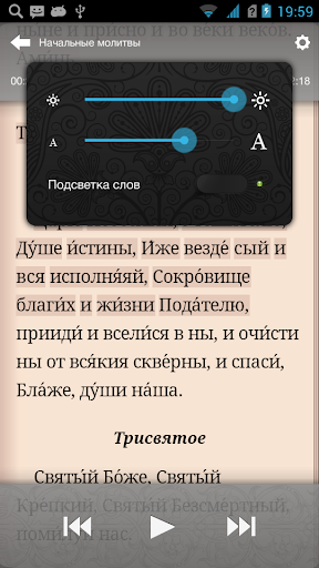 Подсветка произносимых в аудиозаписи слов позволяет визуально не терять читаемое место. При желании синхронную "подстветку слов" можно отключить в настройках.
