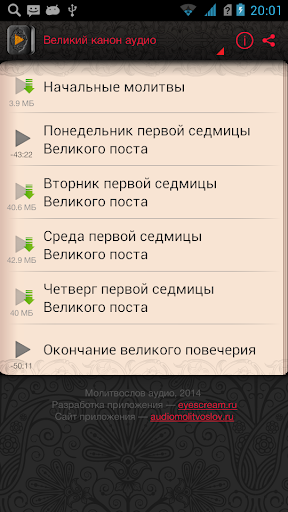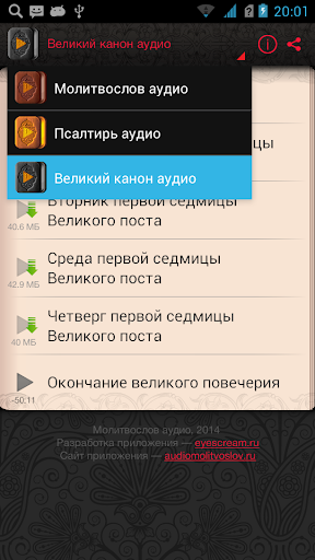 Можно легко переключаться между православными тематическими аудиосборниками через выпадающее меню — доступны: "Православный молитвослов", "Псалтирь", "Велкий покаянный канон святого Андрея Критского".