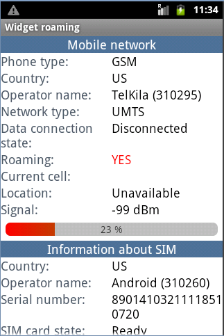 - статус роуминга сотовой сети (ROAMING, NO ROAMING)