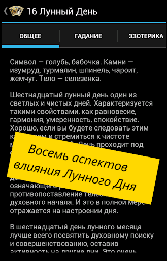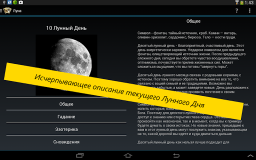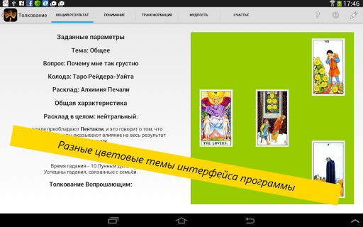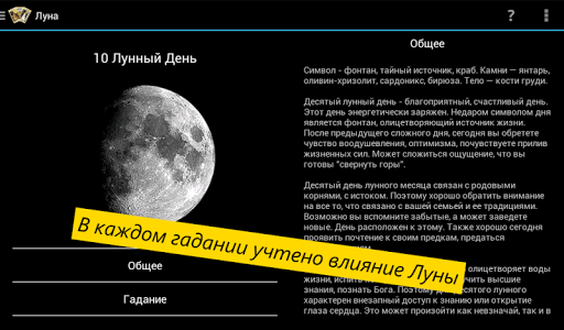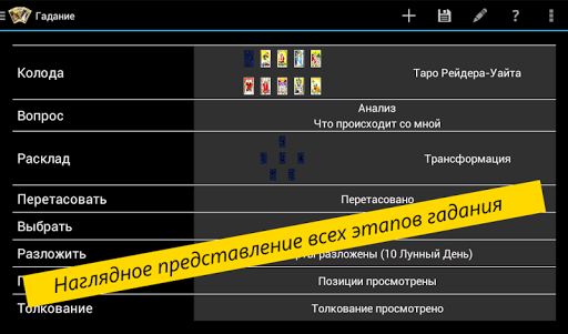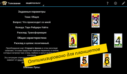 Готовые (или не очень) гадания можно сохранять в Журнал и работать с ними позднее. Для тех, кому важно мнение Луны, в программе есть закладка с информацией о текущем Лунном Дне.