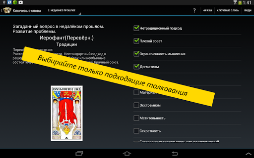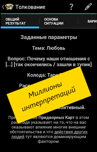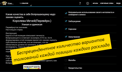 После этого программа вам предложит набор толкований и ключевых слов для ассоциаций. Набор этот зависит от ранее выбранных Темы, Колоды, Вопроса и Расклада, от позиции расклада и от выпавшей в эту позицию карты. Вы сможете выбрать из этого набора наиболее подходящие толкования, а затем ознакомиться с результатом гадания в текстовой форме и занести свои варианты толкований как каждой позиции, так и всего расклада в целом.