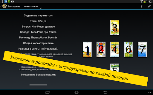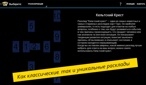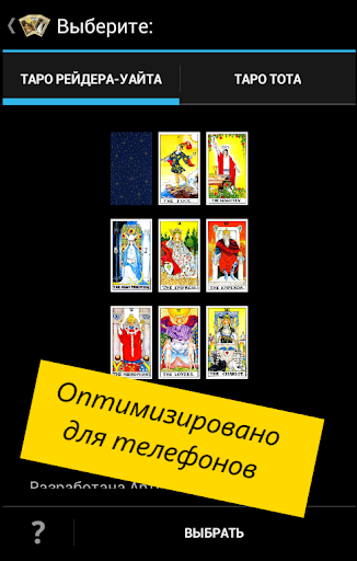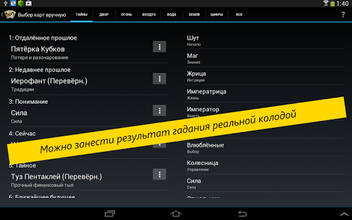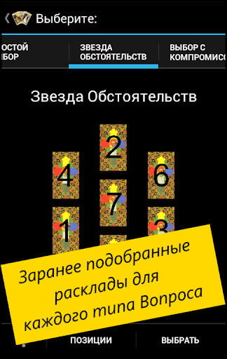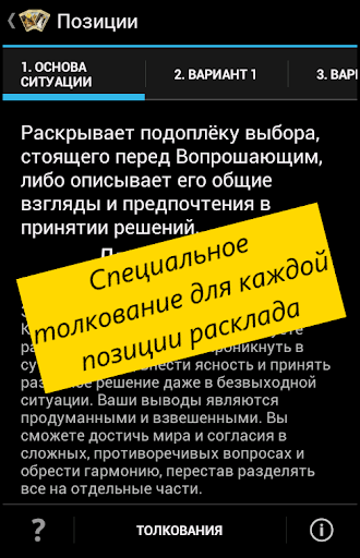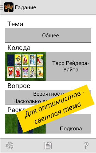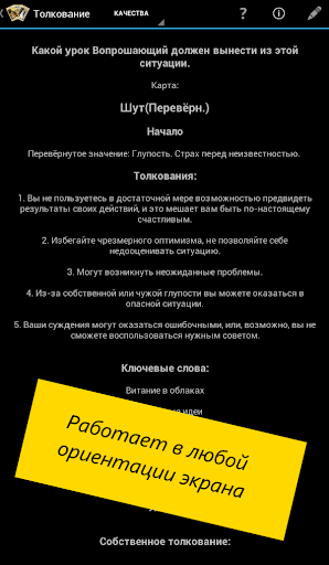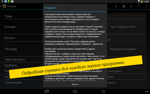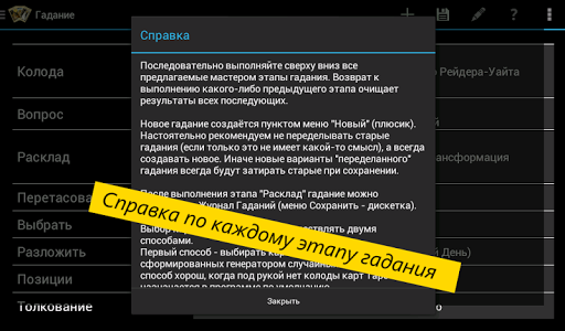 Интерфейс программы Tarot Divination понятен любому владельцу Андроид-устройств. Однако любителям хелпов тоже будет что при желании почитать!