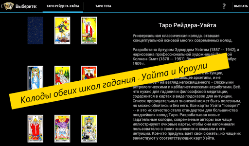 В настоящий момент в программе реализованы толкования для двух базовых колод (Рейдера-Уайта и Алистера Кроули) и более 30 раскладов.