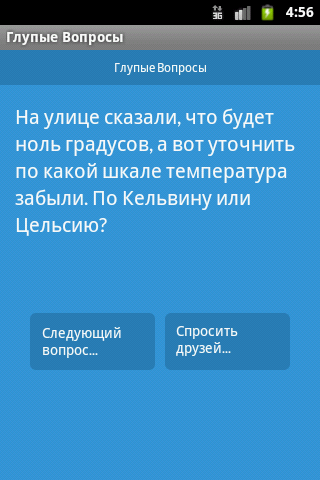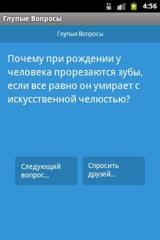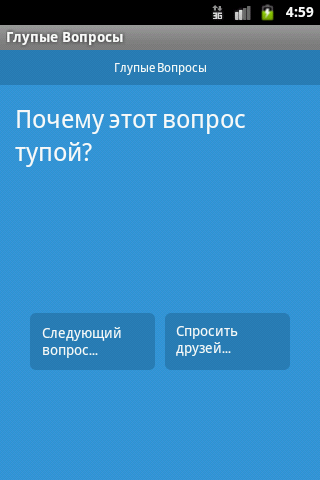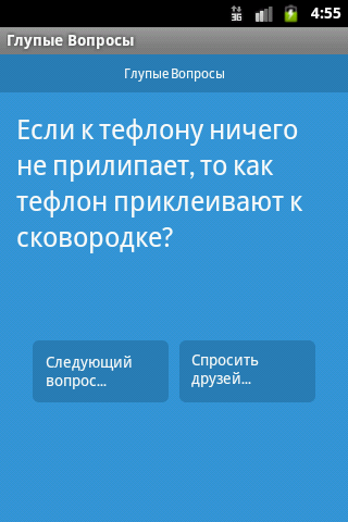 Приложение с сотнями самых тупых и смешных вопросов, на которые практически нет ответов. Если не справитесь сами - задайте друзьям через популярные социальные сети.