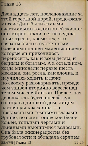 изменение размера шрифта и междустрочного интервала, режимы чтения день-ночь, выбор цветов фона и шрифта, добавление и чтение закладок, а также удобная навигация и поиск.