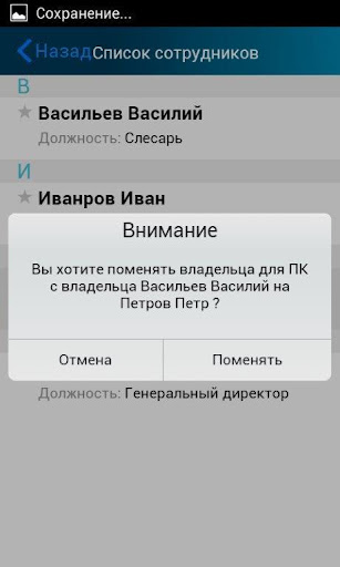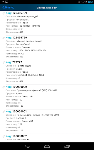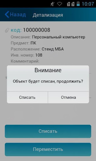 В режиме поиска пользователь может получить информацию о конкретном объекте хранения с возможностью перемещения его между ответственными сотрудниками или списанием.