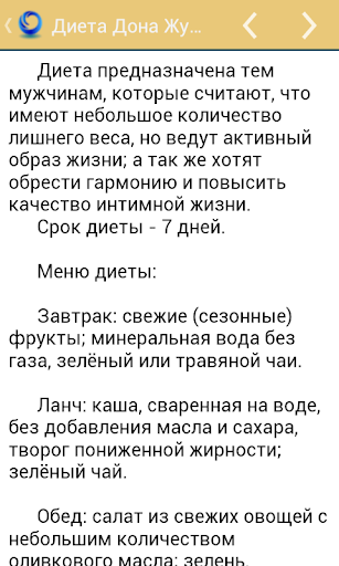 В приложении представлены диеты на все случаи жизни: для снижения веса, для набора веса, для красоты и здоровья, лечебные диеты, для разгрузочных дней, детокс-диеты.