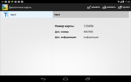 Простое приложение для хранения ваших дисконтных карточек. Не требует подключения к интернету и регистрации. Отсканируйте штрих-код вашей карты, сохраните, и предъявляйте ее на кассах магазина с вашего телефона или планшета.