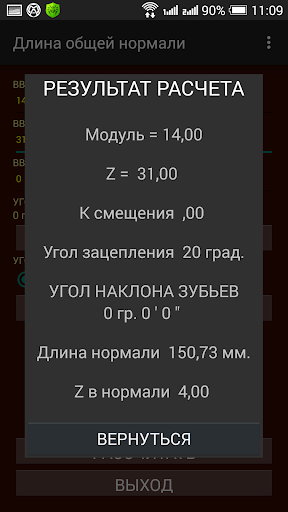 Программа предназначена для расчета длины общей нормали цилиндрического зубчатого колеса по модулю, числу зубьев, коэффициенту смещения и углу наклона зубьев. Может использоваться для контроля нарезки зубьев. При этом прошу помнить о необходимости выполнения гарантированного бокового зазора шестерен.