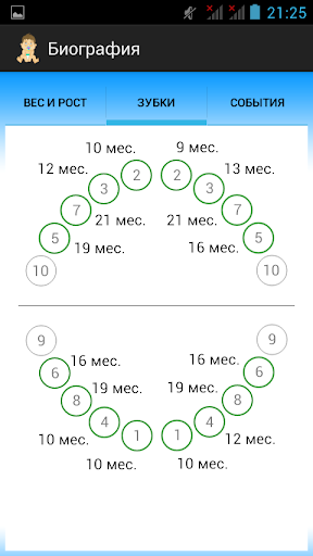 - Биография: внесение данных о росте и весе малыша (сопоставление с нормами ВОЗ), составление графика прорезывания зубов, запись основных событий (ползет на животике, сидит, улыбается и т.д.).