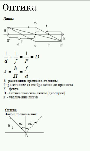 Данное приложение представляет собой сборник наиболее важных формул по всем темам школьного курса физики, которые могут понадобится на Едином Государственном Экзамене. Список тем: Механика, МКТ, Электродинамика, Оптика, Квантовая физика.