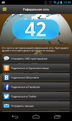 - действующая реферальная система помогает увеличить бонусный счет. Отправьте приглашение друзьям и получайте деньги на свой счет за их поездки.