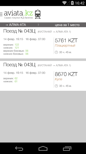 Aviata Railways — сервис, позволяющий купить ЖД билеты КТЖ (Казахстан Темир Жолы) онлайн на все направления по Казахстану и оплатить их с помощью карт Visa/MasterCard любого банка. Купленные ЖД билеты можно распечатать, и затем обменять на железнодорожных станциях Казахстан Темир Жолы, введя код в специальные терминалы КТЖ или поднеся к нему штрихкод. На отдельные поезда КТЖ можно проходить сразу с распечаткой электронного ЖД билета, такие поезда обозначены при поиске буквой «e». Электронные билеты на поезд действительны на всех поездах Тальго.