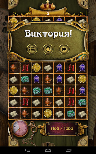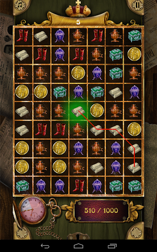 Намедни во всех салонахъ наперебой играют в похожие игры. Но только наша настоящая, знатная имперская игра достойна вас, любезные судари и сударыни. Помогите собрать казну для Великой Империи. Отчизна воистину нуждается в вашей помощи, любезный другъ. Царские рубли, слитки серебра, яички Фаберже, шкатулки жемчуга и красные кожаные сапожища ждут ваших удалыхъ действий. Собирайте более трех одинаковых предметовъ в линию и получайте очки для скорейшего прохода на следующие уровни. Пользуйтесь императорской короной для фееричного увеличения ваших очков. Желаю Вам установить рекорд, что будет вхож в анналы истории! Славныхъ баталий, мой другъ!