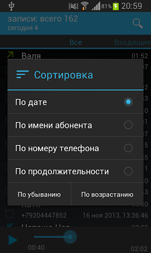 - Сортировка записей «По дате», «По имени абонента», «По номеру телефона», «По продолжительности»