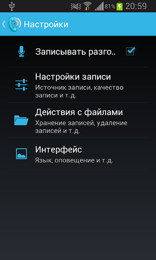 - Отдельные настройки для входящих и исходящих «Записывать все», «Не записывать», «Записывать только контакты», «Записывать только не контакты» (Только в полной версии приложения)