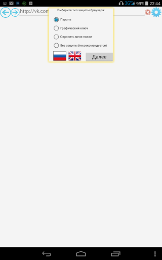 Основным преимуществом данного браузера является его полная защищенность от посторонних глаз, что бывает необходимо когда вашим Android – устройством пользуется кто-то еще, или у вас отключена блокировка устройства. Вы можете сами выбрать тип защиты вашего браузера – это может быть графический ключ или пароль.Браузер имеет одну вкладку. Не хранит историю, но сохраняет кэш и кукиз которые вы сможете очистить.