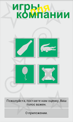 Этот сборник- просто бомба вечеринок. Прекрасное время провождение с друзьями. Лучший сборник для компании. Представляет из себя 3 игры со смартфоном или планшетом: Бутылочка, Крокодил, Фанты. И несколько игр в которые можно играть без смартфона или планшета. Давайте веселиться вместе, вместе с играми для компании.