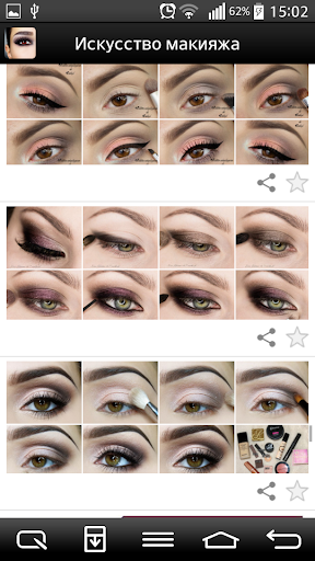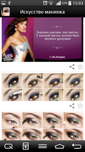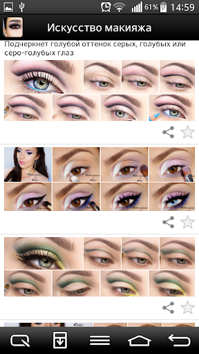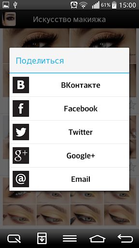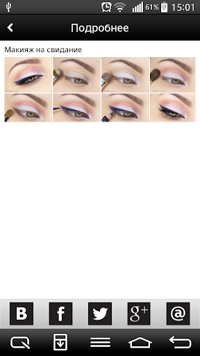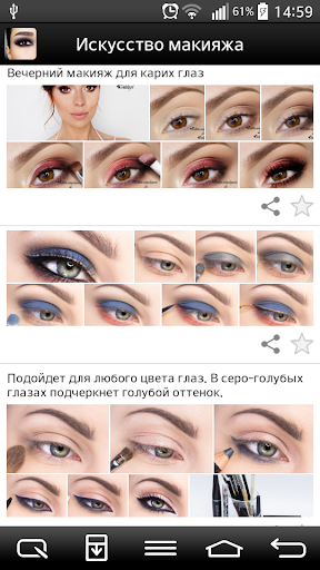 Устанавливайте приложение “Искусство макияжа” на свой смартфон или планшет. Делитесь с подругами в социальных сетях: Вконтакте, Facebook, Twitter или e-mail. Сохраняйте все самое интересное в Избранном!