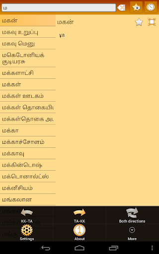 Это Тамильско-Казахский и Казахско-Тамильский Словарь (கசாக்-தமிழ் மற்றும் தமிழ்-கசாக் அகராதி). Приложение работает в режиме ОФФЛАЙН и не требует интернет-соединения для работы.