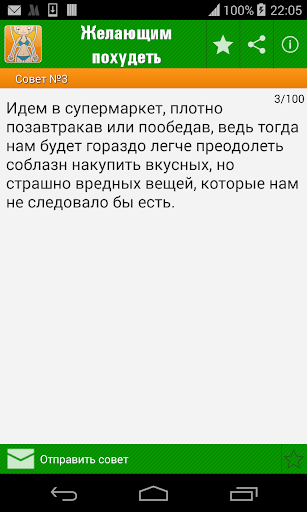Установи приложение, вводи по одному новому правилу в день – и ты удивишься, насколько быстро начнет уходить вес и насколько легко будет проходить процесс похудания. Полезные привычки станут твоим образом жизни, а стройная фигура и здоровое тело станут тебе подарком за старания и предметом зависти окружающих!