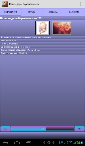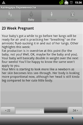 Приложение поможет вам узнать, как развивается Ваш малыш во время беременности. Также описаны состояния будущей мамы, что с ней будет происходить и на что стоит обратить внимание. Информация выдается по неделям развития беременности. Есть встроенный календарь с сохранением заметок и событий в системном календаре. Дополнительные возможности: