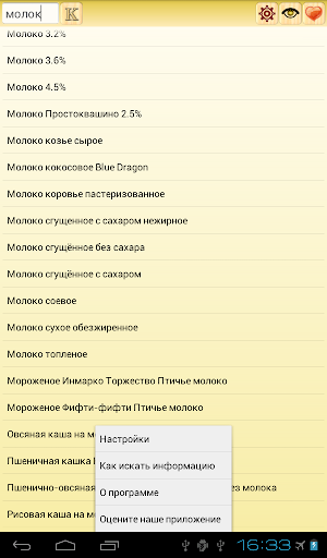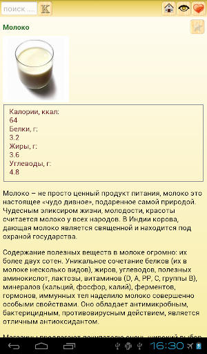 Справочник «Калорийность продуктов» содержит описания обычных и готовых продуктов питания, в том числе готовых блюд, помимо информации о количестве калорий, так же, вы узнаете о содержании белков (протеинов), жиров и углеводов на 100 грамм продукта. Всего в списке насчитывается не менее 3700 продуктов и 2800 фото к ним, многие из них сопровождаются подробной информацией, что помогает анализировать состав более тщательно.