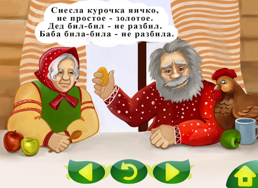 При создании программы-тренажера «Курочка Ряба» учитывались педагогические и психологические методики развития детей. Мы подошли к сказкам инновационно. Мы акцентируем внимание на особенно важных вещах в сказке, стимулируя ребенка запомнить текст сказки. После прослушивания сказки ребенка ждут вопросы и задания по тексту, где он сможет продемонстрировать свои знания. Есть возможность отключить голос диктора и текст, а, значит, и попросить ребенка пересказать содержание сказки. Прохождение рекомендуется в присутствии взрослого.