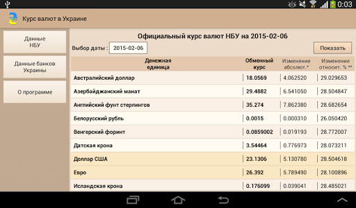 Данное приложение предоставляет информацию о курсе валют Национального банка Украины и украинских банков. Предоставляется информация о курсах как на текущий день, так и архивные данные.