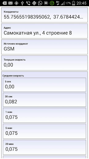 Приложение определяет координаты, адрес, текущую скорость, а также вычисляет среднюю скорость в рамках нескольких временных интервалов